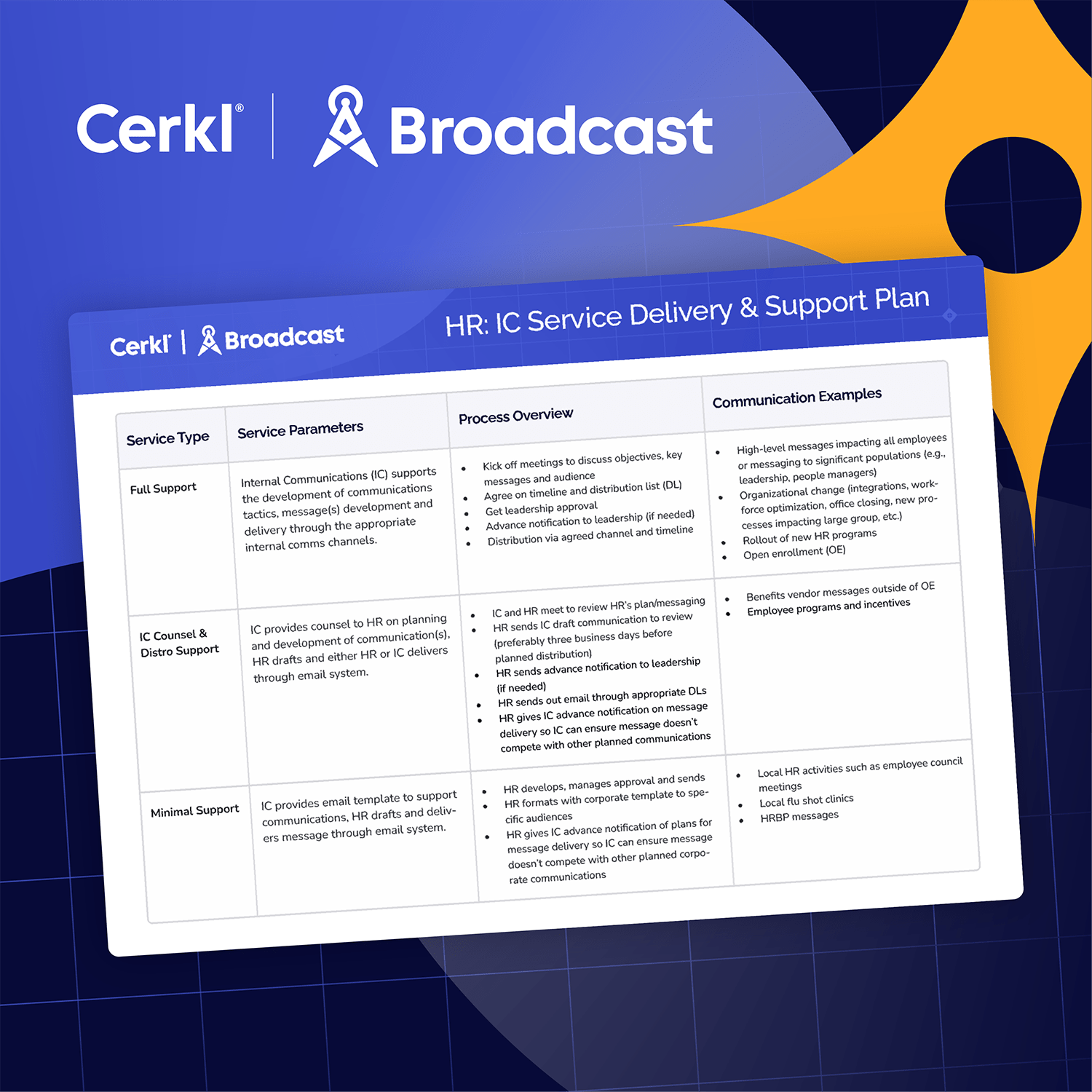 In addition to streamlining communication, an HR: IC service delivery and support plan enhances collaboration between HR and IC by providing a clear framework for decision-making and execution. It encourages proactive planning, ensuring both teams are aligned on objectives, timelines, and delivery methods. This alignment minimizes delays, reduces the risk of miscommunication, and fosters a more cohesive approach to employee messaging.