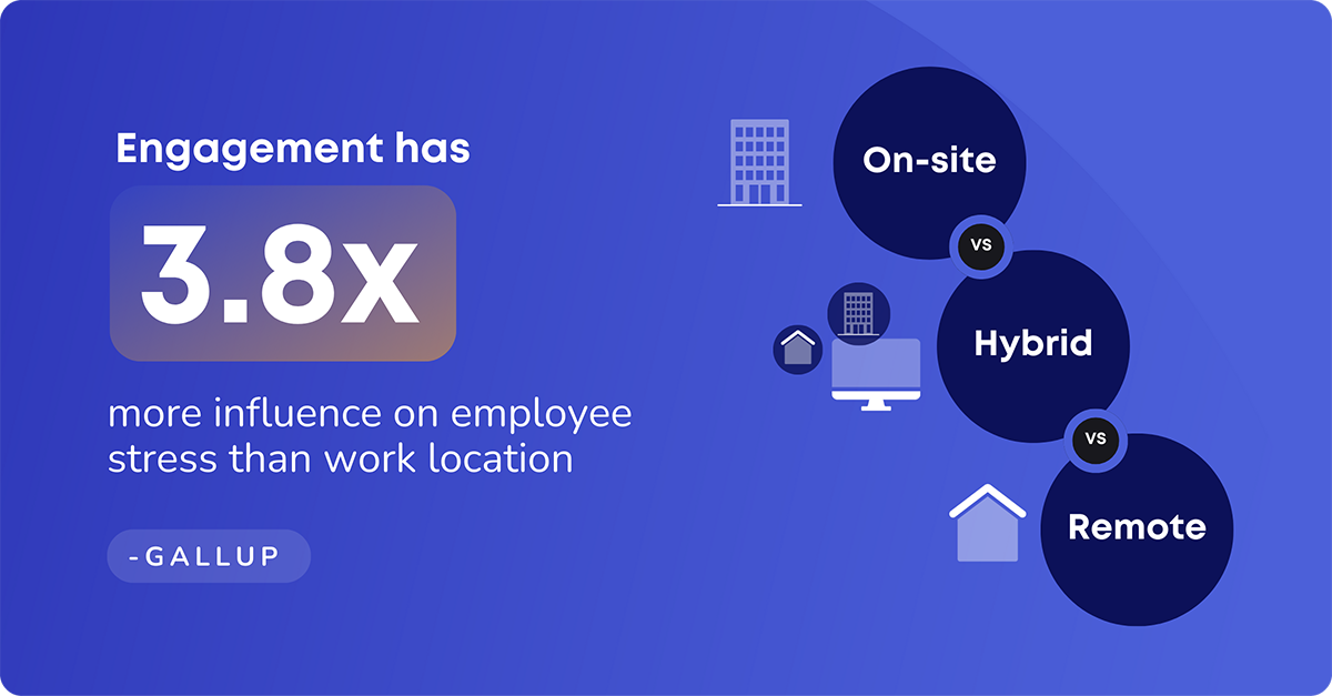 When employees feel engaged, they feel a stronger bond with the organization, which generally leads to greater job satisfaction. These engaged employees tend to have lower stress levels, better life balance accommodating both work and home life, and enhanced employee safety. According to the 2023 State of the Global Workplace Report, engagement has 3.8 times as much influence on employee stress as work location. It states that feelings of enthusiasm and involvement do more to reduce stress than other perceived benefits like where they are sitting.