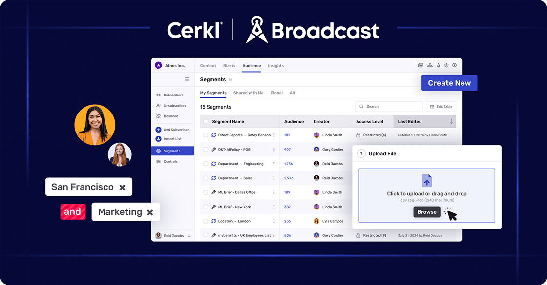 Broadcast also has a dynamic segments builder, together with custom data, and one time uploads, that is great for one-time messaging. It enables internal communicators to build personalized audiences instantly without needing help from IT.