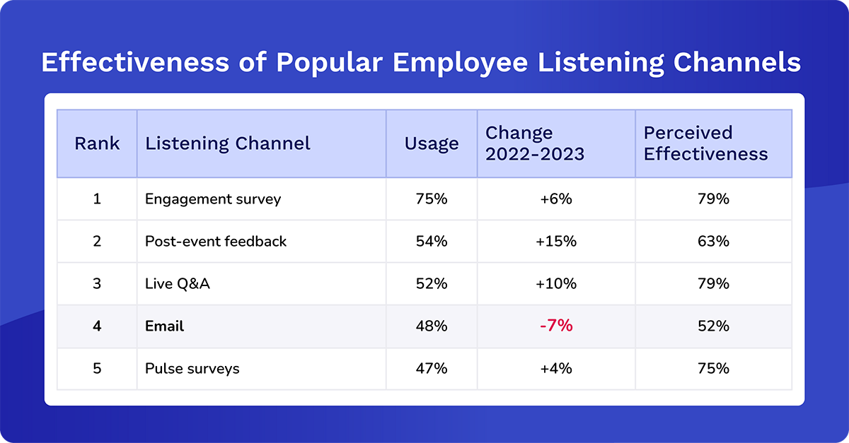 According to Gallagher’s State of the Sector 2023/24definitive report on internal communication trends, measurement and analysis of internal communications remains a top challenge for 2024. However, while email remains the most used broadcast channel, it has dropped down the ranks of being a listening channel for employee feedback, with only half of internal communicators finding it to be effective.