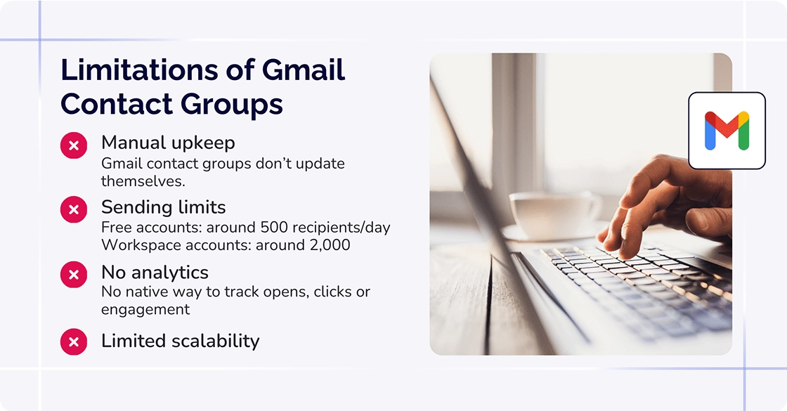 As an example, if your organization needs segmentation, personalization, or analytics to understand message performance, Gmail’s built-in contact groups won’t deliver.