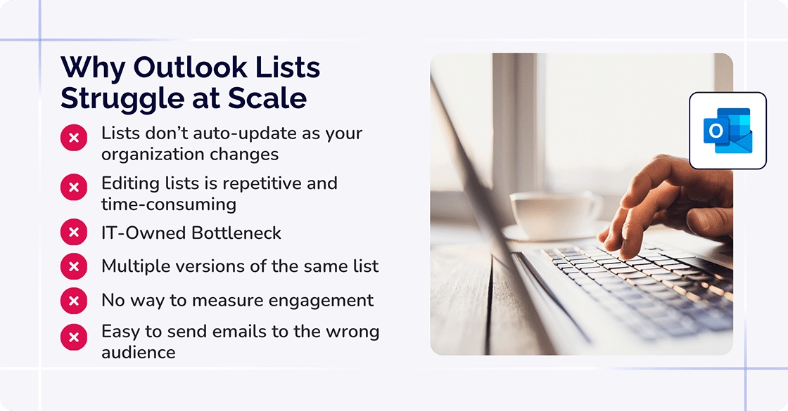 Here’s why traditional Outlook distribution lists often fail to keep up at scale.