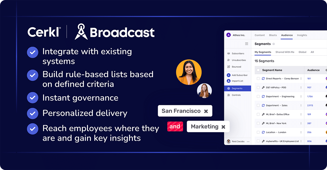 Managing employee lists shouldn’t require hours of manual updates or IT requests. With Cerkl Broadcast, internal communicators can build dynamic, data-driven audiences that stay accurate automatically, turning what used to be an administrative headache into a 10-minute task.