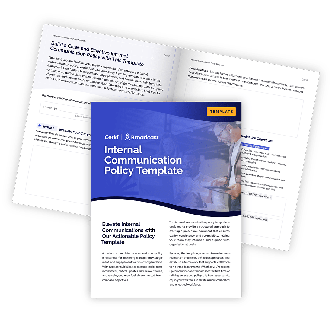 Creating an effective internal communication policy requires more than guidelines. It demands tools that enable clarity, consistency, and control. Cerkl Broadcast is an internal communication platform built on AI, that supports every stage of policy development and implementation by providing the infrastructure and insights needed to bring your policy to life.