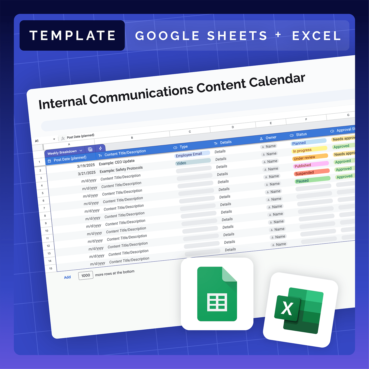 If you need more input in terms of setting up your internal comms content calendar, we’ve got you covered. Acknowledging how important it is to plan your calendar content, we have created an internal communications content calendar template that you can use absolutely free. It’s a spreadsheet template that is available in Excel and Google Sheets.