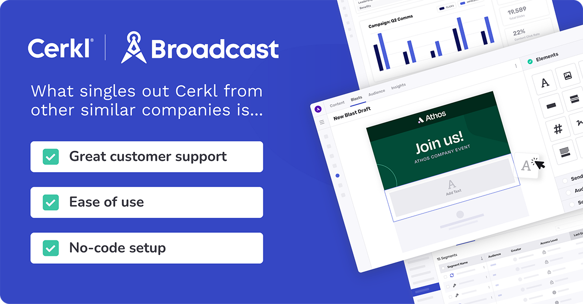 Axios HQ is a good option for organizations looking for an AI-enabled essential communications management (ECM) platform. It prioritizes email and email-based newsletters as the way to communicate with employees. If you need more than barebones email communications, Cerkl Broadcast goes further with its omnichannel and team communication capabilities. Expand to other channels such as Mobile App, Slack, or Teams, and reach your employees on their preferred channels.